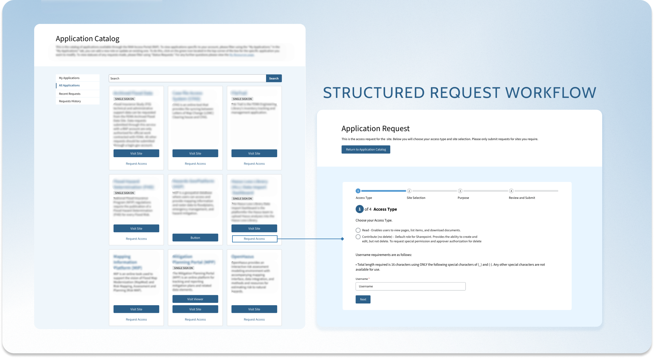 The agency’s centralized application hub served both internal employees and external users, supporting account creation, application discovery, and request management. Over time, the legacy system became fragmented, with inconsistent UI patterns and disjointed user flows. The initiative focused on modernizing the platform architecture while maintaining accessibility and compliance requirements.